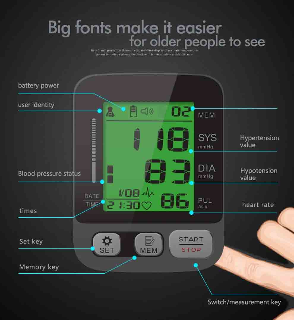 • Large LCD Display: Easy-to-read screen with backlight, showing systolic, diastolic, and pulse rate clearly.